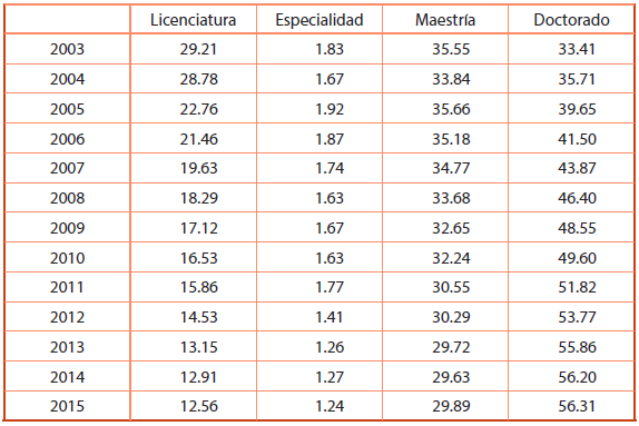 Si bien los datos son representativos, es de señalar la diferenciación salarial que se establece a partir de la obtención de grados académicos, donde el porcentaje de las becas es del 21.5% y éstas se encuentran repartidas dentro de los profesores que obtienen el grado de maestro o doctor y son de tiempo completo, de este perfil se tiene un promedio del 80% entre 2003 y 2015. La diferenciación puede observarse todavía más con el estímulo a la docencia e investigación, el cual sólo se otorga al 17.5%, principalmente Titulares y con el grado de doctor. En síntesis, el 71% de las becas y estímulos están dirigidos a tan sólo 47% de profesores con doctorado, lo cual muestra que el grado de diferenciación es representativo.