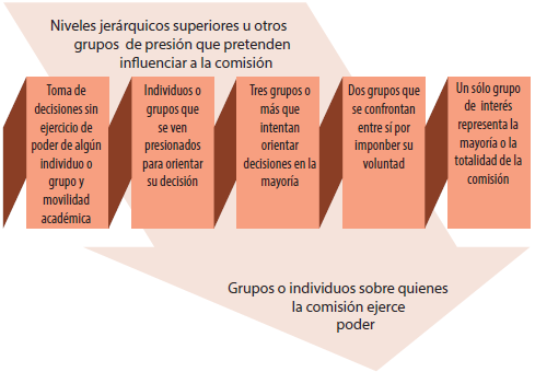 En este sentido, hemos determinado siete niveles de ejercicio de poder dentro de las Comisiones dictaminadoras, considerando la toma de decisiones sin ejercicio de poder por parte de algún individuo o grupo como un estado ideal.