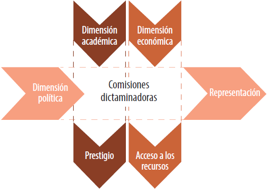 El ejercicio de poder en las Comisiones dictaminadoras adquiere dos dimensiones verticales y una dimensión transversal. Las dos dimensiones verticales son la académica y la económica; la dimensión académica se vincula a la obtención de prestigio académico por parte del evaluado y la económica a la obtención de recursos. La dimensión transversal que atraviesa la económica y la académica es la política toda vez que asumimos que el engranaje evaluativo en el que está sumergida la institución ha tenido como uno de sus efectos la puesta en marcha de esquemas de participación a través de los cuales los diversos grupos existentes en la Universidad buscan estar representados en tales instancias.