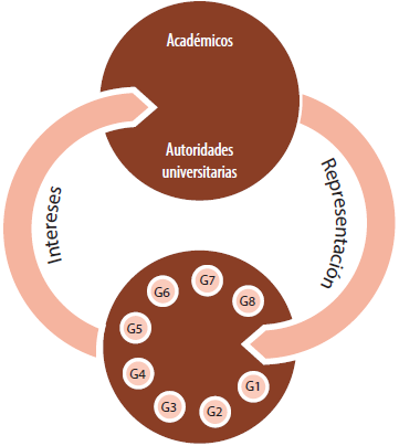 La Figura 3 muestra cómo las Comisiones dictaminadoras están conformadas por diversos grupos que pueden representar intereses de carácter político y académico tanto de los propios académicos como de las autoridades universitarias. En consecuencia, ambos grupos buscan estar representados en dichas instancias; a su vez, los dictaminadores satisfacen el interés de sus representados en la búsqueda de beneficios, ya sea prestigio académico, o bien, mayores ingresos económicos.
