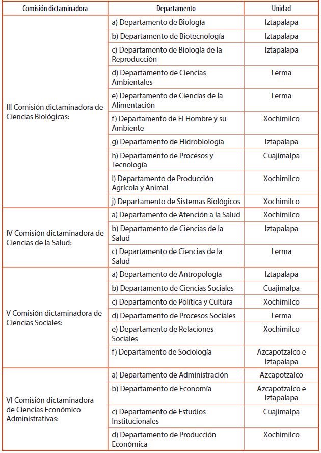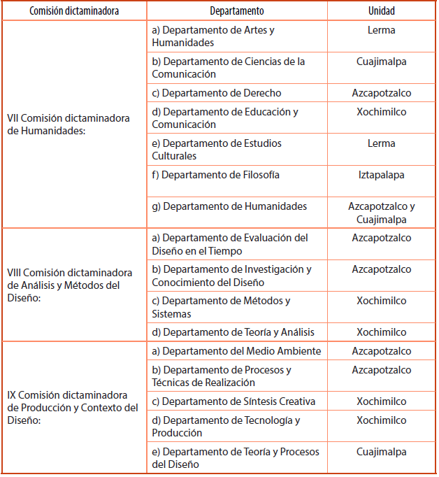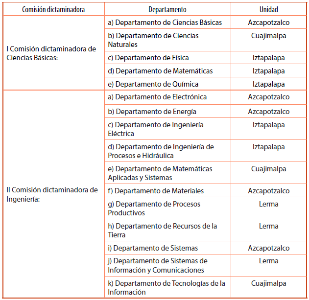 El RIPPPA también establece que existirá una Comisión dictaminadora por cada área de conocimiento que atiende la UAM haciendo un total de nueve Comisiones dictaminadoras (Tabla 1).
