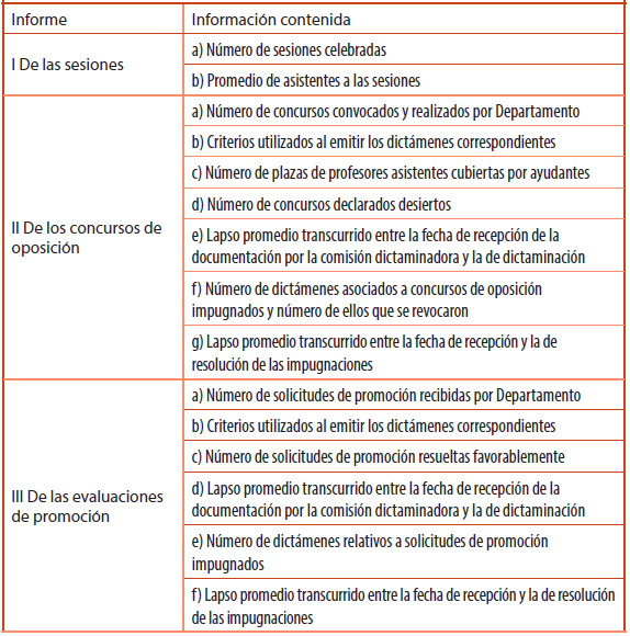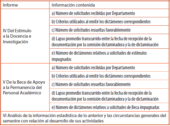 Además de este informe, las Comisiones también dan cuenta de los criterios a utilizar para la emisión de sus dictámenes, al inicio de su periodo de actividades y cada que sean modificados, siendo estos los únicos aplicables a todas y cada una de las resoluciones tomadas (RIPPPA, art. 44 bis), de acuerdo con los entrevistados, estos criterios incluyen desde los que guiarán las sesiones, los referentes a la toma de decisiones y quórum y los que se utilizarán para dictaminar la información del ingreso y promoción del personal académico.
