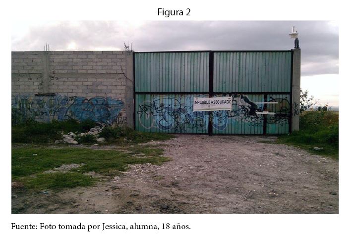En la Figura 2, Jessica muestra un territorio cercano a su hogar que constituye un reto a vencer, la historia de una casa de seguridad ubicada en la misma calle donde vive, expresa la inseguridad que la localidad refleja. El caminar de Jessica también busca rutas que impidan que su paso se acerque a este lugar que signa en su entrada el aviso de peligrosidad extrema: