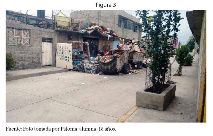 Un lugar muy desagradable está justo enfrente de mi casa, pues mi vecina trabaja en la basura y su casa es eso, un basurero, tiene los carros y carretas llenos de suciedad, muchos animales y siempre huele muy feo, y no sólo es la manera en la que vive sino que afecta a todos los vecinos pues hay muchas ratas y cucarachas, la calle nunca está limpia y lo peor es que siempre niega que todo eso sea suyo, el municipio nunca hace nada, los de ecología llegan y se meten así como si nada, y es hasta vergonzoso invitar a alguien a mi casa, porque la vecina hace que toda la calle luzca fea y desagradable (Paloma, alumna, 18 años).