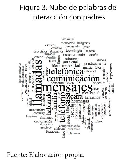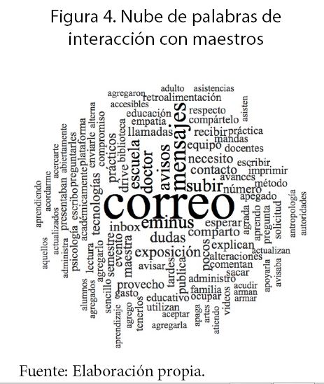 Otro mundo con el que interactúan recurrentemente los jóvenes es el de asociados, específicamente con maestros, con quienes cohabitan en su vida escolar cotidiana. La interacción con los profesores se ha visto significativamente modificada por la aparición de las redes sociales digitales. Al realizar un análisis, con el auxilio del software NVivo, de las palabras que más se asocian con la comunicación que tienen los estudiantes con sus maestros, se dio la aparición de conceptos como correo electrónico, además de redes socio-digitales (Facebook y WhatsApp), esto determina que la comunicación digital es una vía de interacción social que este grupo de estudiantes mantiene con sus profesores.