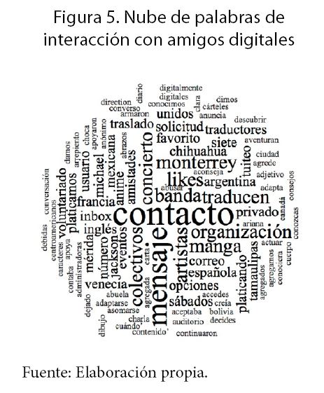 A todos los jóvenes dentro de las interrogantes que iban dirigidas a cuestionar cómo era su interacción con padres, maestros, entre otros, se les preguntaba si, además de esos sujetos, tenían interacción con otro grupo de personas que no se hubiera mencionado aún, así en el caso de una serie de jóvenes entrevistadas, apareció lo que denominaron como amigas digitales con las que comparten gustos e intereses.