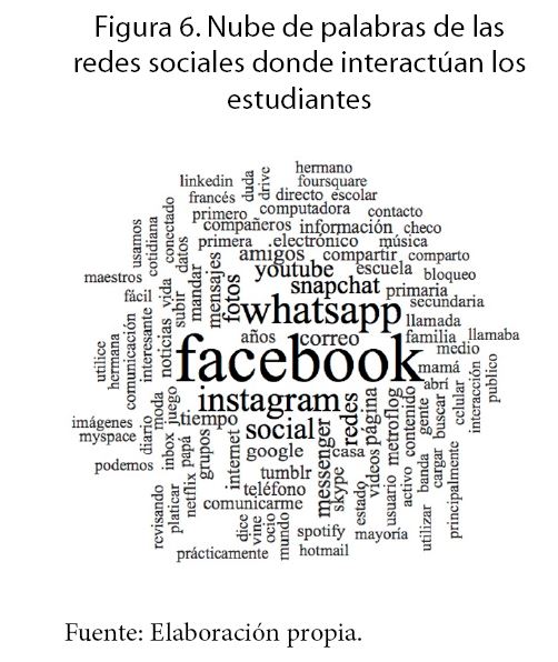 Al profundizar qué otras redes son utilizadas por los universitarios además del caso de Facebook, se identificó WhatsApp, misma que ha crecido en la predilección de uso e interacción de los usuarios de redes no sólo jóvenes; otras mencionadas fueron Instagram y Snapchat, reflejando el crecimiento de redes utilizadas que comienzan a tomar un sitio cotidiano en los hábitos digitales de los jóvenes. El correo electrónico fue una red que destacó por su uso académico, y se mantuvo como la más recurrida por profesores para su comunicación con estudiantes. Otras redes que fueron mencionadas fueron los casos de YouTube, Tumblr, Google, Linkedin, Watpad, Skype, Spotify e Inbox de Messenger; además de la aparición de redes como Metroflog y Myspace.