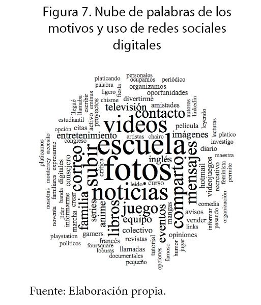 Finalmente, en la categoría de significatividad se identificaron los sentidos (motivos y razones de uso) y beneficios que cada joven otorga a su interacción social, ya que no todos reconocen el mismo sentido, beneficio o rol al utilizarlas. Como ha sido una constante, dentro de los principales motivos y beneficios del uso de redes sociales digitales, se encuentra lo relacionado a los temas escolares, aunque también existieron otros sentidos de uso como, por ejemplo, el mantener recuerdos a través de las fotografías digitales y el consumo de noticias, entre otros usos que pueden encontrarse dentro de la Figura 7.