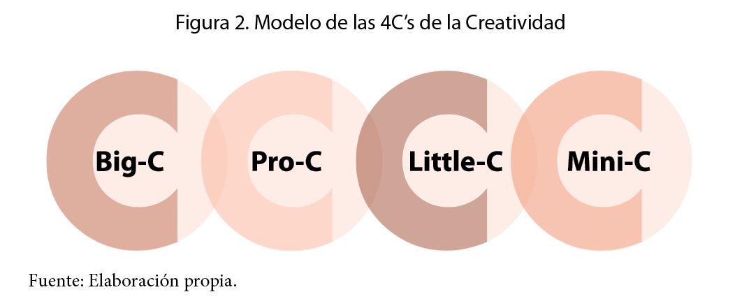Entendiendo a la creatividad como un proceso continuo, todos tienen el potencial de ser creativos de diferentes maneras y en diferentes niveles. No se espera que las personas sean creativas todo el tiempo o en todos los dominios. Así, Helfand et al. (2016) propusieron el modelo de las 4C’s de la creatividad clasificándolas en cuatro niveles, según muestra la Figura 2.