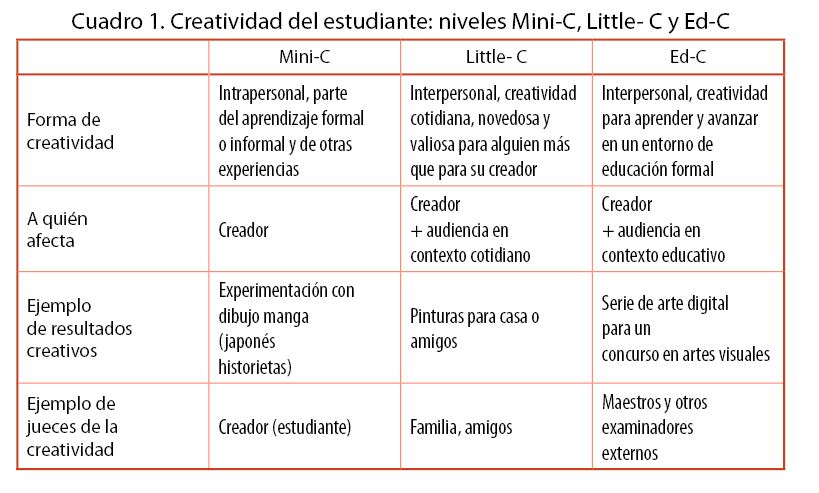 Nociones similares a Mini-C y Little-C también se encuentran en el trabajo de Maslow (1968) y Rogers (1970), quienes vieron la creatividad como esencial para nuestra adaptación diaria, dar forma a nuestro mundo, y como parte de la autoexpresión y la autorrealización. A través de la investigación con estudiantes de secundaria altamente creativos, estos autores sostienen que el modelo de creatividad de las 4C’s se puede ampliar para capturar mejor la creatividad de los estudiantes con fines educativos, incluyendo mejoras en el aprendizaje y el rendimiento.