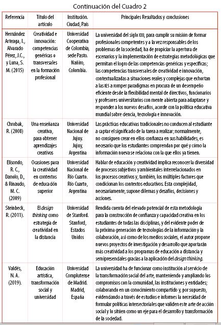 En el Cuadro 2 (y continuación) se muestran los resultados obtenidos en la revisión de los documentos seleccionados sobre las experiencias sobre la creatividad en el ámbito de la educación superior. En las últimas décadas, esta metodología ha contribuido a la revisión del conocimiento científico, utilizándose para estudiar un determinado campo de investigación. Así, gracias a esta herramienta, se puede obtener información bibliográfica de las principales tendencias de investigación relativa a experiencias relacionadas con el impacto del aula invertida en la etapa universitaria. La puesta en marcha de una metodología activa coincide con la necesidad de lograr un aprendizaje significativo para que los futuros profesionales sean capaces de adaptarse a la compleja sociedad actual.