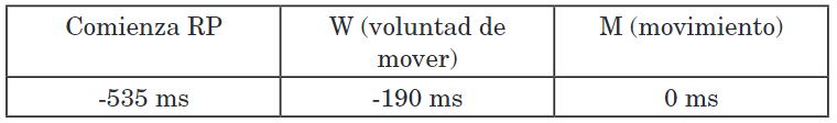 Dado que tanto el EEG como el EMG tienen un registro temporal preciso y, por otra parte, el reporte de la posición del reloj por parte del sujeto también fija un tiempo concreto para la ocurrencia de la intención, el experimentador procede a promediar los datos y posicionarlos en el eje temporal. Los resultados son sorprendentes. Con respecto al tiempo cero de referencia establecido por el comienzo de la contracción muscular de la mano o dedo, el tiempo en que el sujeto experimenta conscientemente el deseo espontáneo de realizar la acción (tiempo W, por “will”, en la nomenclatura del experimento) es de -190 ms. (milisegundos), aproximadamente una quinta parte de segundo antes del movimiento muscular y en concordancia con la idea intuitiva de que primero tenemos la intención de movernos y después lo hacemos. El dato realmente inesperado es el tiempo en que comienza el alza del RP: -535ms (aprox. medio segundo antes de la acción). En otras palabras, más de 300 ms. antes de la intención consciente de realizar el movimiento, el cerebro ya comienza a activarse en las zonas premotoras. Ilustremos los tiempos en la siguiente tabla: