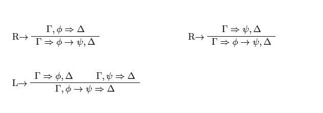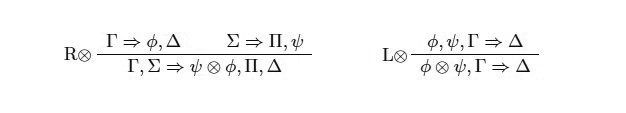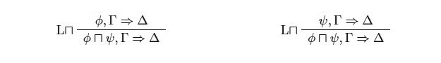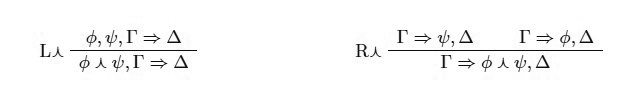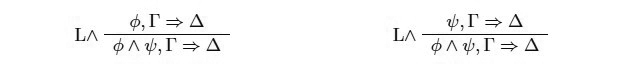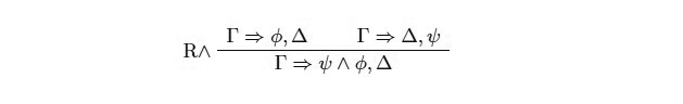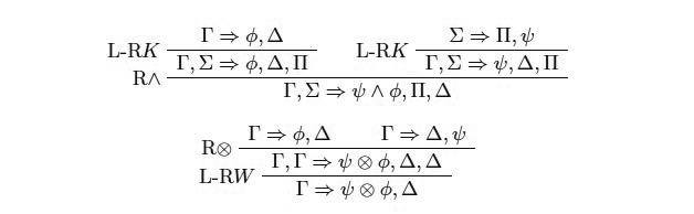 Así, tanto ∧ como ⊗ son solo dos símbolos diferentes para representar la conjunción. En lógica clásica, ambos pares de reglas son interderivables y por lo tanto no es relevante cuál de ellos elijamos a la hora de formular un cálculo. Esto es así dado que una vez que monotonía y contracción están presentes tenemos las siguientes derivaciones (asumiendo las reglas de la izquierda correspondientes):