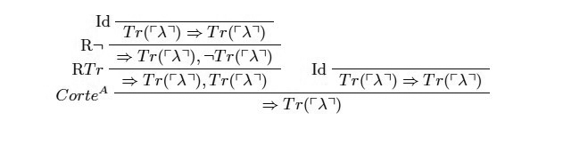 Esta es una derivación de la famosa paradoja del mentiroso. De dicha derivación se puede observar que además de las reglas para la negación y para el predicado veritativo, todas las reglas estructurales han sido aplicadas.