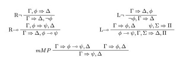 En primer lugar, cabe resaltar que el cálculo así presentado no contiene de manera explícita ninguna regla estructural. De hecho, dado que reflexividad en particular no está presente el conjunto de secuentes derivables es vacío. En segundo lugar, la regla mMP por meta Modus Ponens21 es una regla de eliminación para el condicional22.