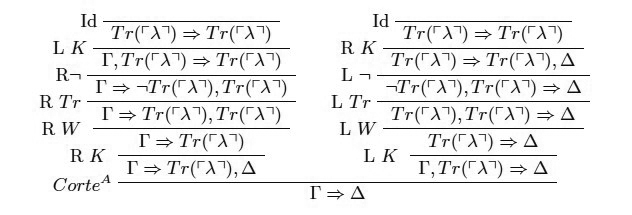 con Σ, un multiconjunto arbitrario de fórmulas y Γ algún multiconjunto de fórmulas que contenga a γ. Como en el caso de la derivación de la paradoja del mentiroso, aquí también todas las reglas estructurales han sido aplicadas, junto con las del condicional y las del predicado veritativo.
