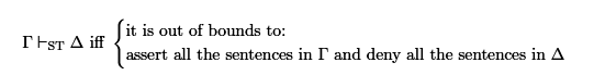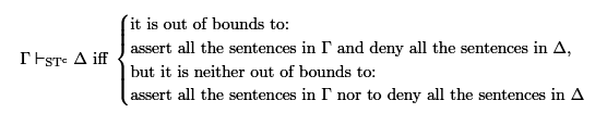 In a nutshell, we propose to ask of an out of bounds position that the assertion of the premises and the denial of the conclusions contained in it are not out of bounds per se—i.e. when considered as separate collections of speech acts—but only in conjunction. This leads us to consider a fragment of ST that we will call STc. We define next what it means for an argument to be valid in this system: