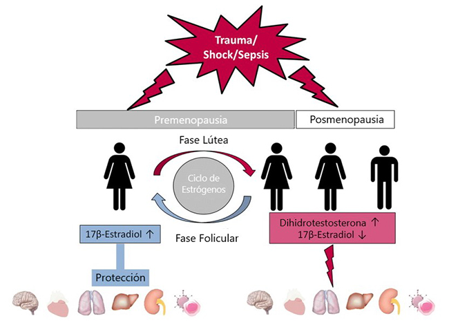 Como muestra la Figura 1, este modelo del rol del estradiol en la mejora en la resistencia a la sepsis de las heridas predice por lo menos cuatro “sexos” a través de dos grupos de tratamiento: las hembras que están en la fase folicular, las hembras que están en la fase lútea, las hembras que están en la postmenopausia, y los machos. Otras consideraciones que podrían mediar el efecto del estrógeno sobre la sepsis de las heridas pueden incluir la adiposidad masculina, si los machos o hembras de nacimiento tomaron hormonas exógenas, la pre-pubertad, el embarazo/lactancia, y otras condiciones no ovulatorias. En síntesis, para esta investigación sobre la sepsis de las heridas, materialmente, el estrógeno es una variable biológica relacionada con el sexo, pero no una variable “femenina” —y comparar machos y hembras para entender sus efectos terapéuticos resulta inadecuado—.