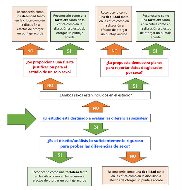 Como muestra la guía del árbol de decisiones del NIH sobre el SABV para los revisores de subvenciones (Figura 2), el requisito principal de la política es que los/as investigadores/as incluyan materiales o especímenes de “ambos” sexos y que comuniquen los datos desglosados por sexo —o sea, masculino y femenino—. Es decir, el sexo se operacionaliza en esta política de una sola manera: como el binario masculino y femenino.