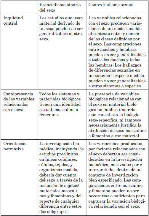 El contextualismo sexual ofrece a los/as investigadores/as una guía constructiva para la consideración de las variables biológicas relacionadas con el sexo que reconoce la omnipresencia de las variables relacionadas con el sexo en los materiales de investigación, así como también este disenso y su complejidad. La tabla 1 contrasta las pautas para las normativas de considerar al sexo como una variable biológica siguiendo un marco esencialista del sexo y un marco contextualista del sexo, respectivamente. Ambos marcos afirman la importancia de atender a la variación producida por factores relacionados con el sexo en la investigación biomédica, y ambos contemplan que las variables relacionadas con el sexo pueden estar presentes en materiales no sexo-específicos y no reproductivos. Pero el marco contextualista del sexo no parte de la premisa de que las subclases de sexo relevantes son “masculino” y “femenino”, no insiste en que la presencia de variables biológicas relacionadas con el sexo en el material biológico implique una relevancia funcional para la biología específica del sexo, y no trata al “sexo” como una variable en sí misma.