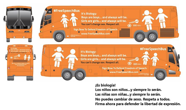 Más allá de los ámbitos de la salud y la investigación biológica básica, los marcos biomédicos para conceptualizar el sexo también tienen consecuencias en el ámbito de la ley y las políticas públicas. A nivel mundial, los movimientos antifeministas y anti-LGBTQ apelan cada vez más a la ciencia biológica como la base de los roles de género tradicionales y para el no reconocimiento de las minorías de género (Butler, 2019). Como un emblema de este movimiento, el denominado “#FreeSpeechBus” (Figura 3), realizó giras por Europa y América del Norte en los últimos años. El bus está decorado con imágenes de dos infantes, una de ellas con el cabello recogido en dos coletas y un vestido, con los cromosomas XX y XY impresos sobre los genitales. En los carteles del autobús se puede leer “¡Es biología! Los niños son niños y siempre lo serán, las niñas son niñas y siempre lo serán” (Hawkins, 2017).