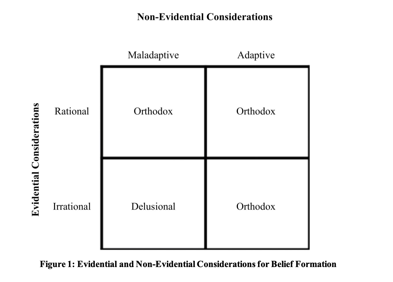 The figure represents cases in which both non-evidential and evidential considerations are at play. For example, imagine a person has a headache for most of the day, so they decide to take some pain medication. The belief at work here is that taking the medication will alleviate their pain. A belief like this one would occupy the top right cell (and would thus be orthodox) because it is motivated by both rational evaluation of evidence (taking pain medication has helped with pain in the past) and adaptivity (having this belief facilitates the alleviation of pain).