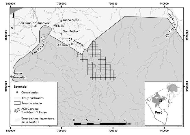 Se establecieron al azar 84 cuadrículas de 1km2 (84 km2 en total), en el área de la cuenca de Quebrada Blanco (Figura 1), para el estudio de especies grandes (sachavaca, venados del género Mazama, sajino, huangana y primates grandes), y pequeñas (majaz, añuje, armadillos y crácidos). En estas se realizó la detección de las especies utilizando métodos no invasivos: búsqueda por avistamiento o señales y rastros en transectos y trampas-cámara. Para ello, se establecieron aleatoriamente tres transectos no lineales de aproximadamente 600 m, ubicados desde los vértices al centro de la cuadrícula. En cada transecto se buscaron señales y rastros (huellas, heces, marcas, entre otros) o registros directos (avistamientos y cantos) que indiquen la presencia de las especies. Cada evidencia fue georreferenciada, registrada y organizada en una base de datos. Se establecieron estaciones de trampa-cámara (una por cuadrícula) en 50 de las 84 cuadrículas de muestreo, las cuales estuvieron operativas durante un máximo de 75 días. Las estaciones de trampas-cámara fueron colocadas en sitios donde las evidencias de presencia de las especies focales indiquen una alta probabilidad de detección de las mismas. La accesibilidad de las cuadrículas y vulnerabilidad ante presiones de cacería fue caracterizada con tres covariables cuantitativas relacionadas con la heterogeneidad espacial de cada celda: distancia lineal de las cuadrículas a la red hidrográfica que sirve de vías de acceso al área (D_RED), distancia real a los centros poblados (D_CP) y distancia lineal a los campamentos de cacería (D_CAMP). Estas covariables se calcularon a través del procesamiento y análisis de capas de información geográfica con Sistemas de Información Geográfico (SIG), utilizando ArcView 3.2®.