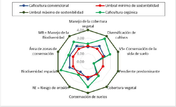 Los subindicadores, Área de zonas de conservación y Manejo de la cobertura vegetal, son puntos críticos porque no han mejorado de lo convencional a orgánico, sobre las causas, Márquez (2015), menciona que es efecto del minifundio con unidades agrícolas de menos de 5 hectáreas, alto porcentaje de fincas con pendientes pronunciadas, alto costo de producción, baja disponibilidad de mano de obra y precio del café pergamino seco dependiente de las bolsas de valores, aspectos que están poniendo en riesgo la sostenibilidad de las fincas así mismo Cerón et al., (2014) indican que el “manejo de suelos y coberturas” constituye el factor que atenta contra la integridad ecológica de los sistemas productivos agrícolas en comparación de “residuos sólidos”, “aspectos socio- económicos” y “político-institucionales” que favorecieron la sostenibilidad agroecológica de las fincas evaluadas.