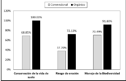 La Figura 2, muestra que relación porcentual de las fincas que lograron sustentabilidad en los subindicadores ambientales evaluados, encontrándose que a nivel convencional las fincas sustentables en conservación de la vida del suelo, riesgo de erosión y manejo de la biodiversidad fueron el 68.8, 37.7 y 70.49% respectivamente a diferencia del orgánico donde el 100, 72.13 y 91.80 % lograron ser sustentables en las mismas variables. Estos resultados reflejan que a pesar de tener un indicador ambiental general sustentable el porcentaje de fincas convencionales que no lograron sustentabilidad fue de 39.33%, cifra mayor al 8.20% de las fincas orgánicas.