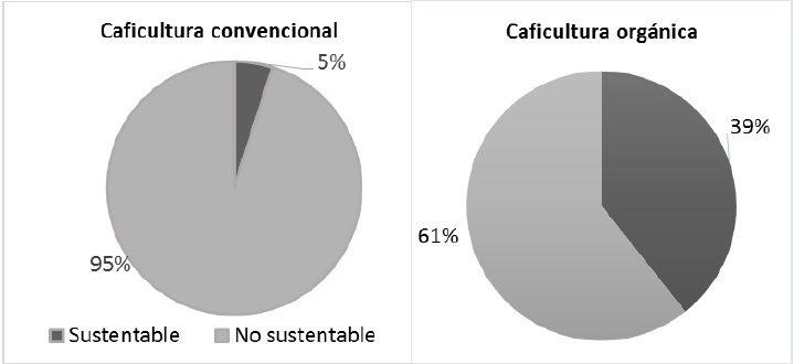 Para que una finca sea considerada sustentable las fincas deben haber obtenido valores mayores a 2 en todos los indicadores. Con este criterio, cuando las fincas trabajaban con el sistema convencional, 37 fincas (60.66%) eran ambientalmente sustentables, esta cifra aumentó a 56 (91.8%) cuando eran fincas productoras de café orgánico (Figura 3).