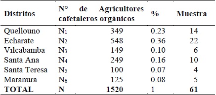 La población de unidades agropecuarias (UA) cafetaleras orgánicas en la zona de estudio fue de 1 520 UA, de ésta se tomó una muestra (n=61). El tamaño de muestra se calculó usando el método de Murray & Larry (2009). En la Tabla 1 se presenta la distribución de la muestra en cada uno de los distritos estudiados, los agricultores se seleccionaron de forma aleatoria entre la población disponible en el marco muestral de cada distrito.