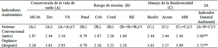 - El sistema de producción orgánica alcanzó un mayor Indicador General Ambiental (IA = 2.71), más alto que el obtenido por el sistema de producción convencional (IA=2.08).