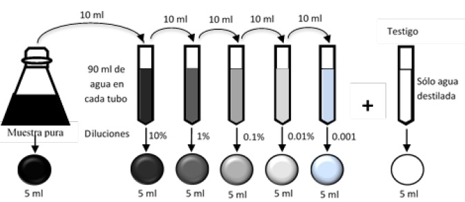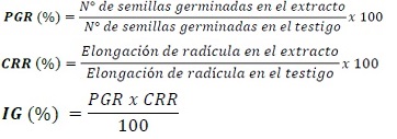 En discos de papel filtro colocados sobre placas de Petri esterilizadas se embebió 5 ml de Alpa-biol puro y diluido al 10%, 1%, 0.1%, 0.01%, 0.001%, y un testigo de sólo agua destilada (Figura 1), a razón de 3 placas por dosis. Se distribuyeron 20 semillas en cada cápsula y estas se almacenaron en una caja de tecnopor a 25 °C por 120 horas. Se calculó el porcentaje de geminación relativo (PGR), el porcentaje de crecimiento de radícula relativo (CRR) (Figura 2), y con estos los Índices de Germinación (IG) para cada dosis, mediante las siguientes ecuaciones (Tiquia, 2000):