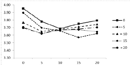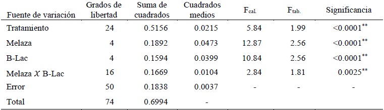 Con el ANOVA de 2 criterios se determinó que la acidez de los tratamientos se incrementó en forma significativa debido al efecto de la melaza (p<0.0001), del B-Lac (p<0.0001) y por el efecto de interacción entre ambos (p= 0.0025) (Figura 3). Los tratamientos carentes de melaza y B-Lac presentaron un pH altamente ácido menor a 4.0; sin embargo, diferían significativamente (según la Prueba de Tukey) con el promedio de pH de los niveles superiores (5%, 10%, 15% y 20%), los cuales presentaron similitud estadística (Ver Anexo 2).