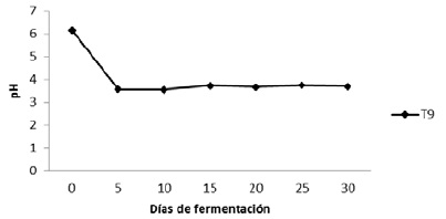 El tratamiento de elección fue el T9, compuesto por 5% de B-Lac, 15% de melaza, 40% de heces de alpaca y 40% de lactosuero, por su mayor acidez (pH= 3.57) y menor contenido de B-Lac (el insumo más caro y menos accesible). El T9 tenía sabor agridulce, no presentó olor fétido, y mantuvo su pH casi constante por 30 días (Figura 4). Según Vásquez et al. (2009), las BAL inhiben patógenos no deseados, permitiendo alargar la vida útil de los bioproductos. García (2008) señala que la estabilidad en biofermentos acelerados está dada en función de su acidez por periodos mayores a 6 meses; coincidiendo con los resultados de Ortega & Arias (2015), basados en la evaluación de la estabilidad de un bioproducto compuesto por microorganismos benéficos conservado a temperatura ambiente por 6 meses, con mínima variación de la acidez y carga microbiana. En base a esto se considera que el Alpa- biol es un bioabono estable en el tiempo.