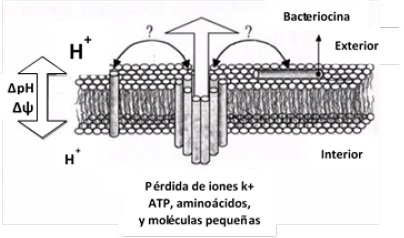 Las poblaciones de coliformes fecales, totales y E. coli fueron inferiores a los límites de detección por la técnica de Número más Probable (<3 NMP·g-1), lo cual se interpreta como ausencia en el ensayo, evidenciando una reducción total de la carga enteropatógena a partir de las heces frescas de alpaca (Tabla 4). Peralta et al. (2016) obtuvieron resultados similares con heces de ganado vacuno tratadas con B-Lac, y según Parra (2010), esto se debió al efecto supresor de las BAL sobre cepas competidoras, principalmente mediante la producción de ácidos orgánicos y bacteriocinas. Un pH ácido desestabiliza los componentes celulares y funcionales como las proteínas, condición que no afecta a las BAL ya que estas poseen un mecanismo de expulsión de hidrogeniones al exterior celular (Madigan et al., 2004); mientras que las bacteriocinas consisten en péptidos que se anclan a la membrana celular formando poros (Figura 5), lo cual provoca pérdida del potencial de membrana (Cotter et al., 2005). El espectro de acción de las BAL comprende enteropatógenos como: E. coli, Salmonella, Streptococcus, Staphylococcus aureus, Campilobacter, Clostridium botulinum, Listeria monocitogenes, entre otros (Carrasco et al., 2002).