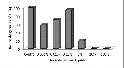 Los efectos letales sobre la germinación de la lechuga (Lactuca sativa L.) se observaron con la inoculación del Alpa-biol puro y diluido al 10% (Figura 6), indicando una fuerte presencia de sustancias fitotóxicas, según Zucconi et al. (1981). Al respecto, Zapata et al. (2005) afirman que estos casos se deben a una alta concentración de sales; considerando que la tolerancia de la lechuga a la salinidad oscila entre 1.4 a dS·m-1 (Faquin & Furlani, 1999), parámetro que es considerado para el monitoreo de este cultivo en hidroponía. Otro factor implicado es la acidez, ya que el pH óptimo de la lechuga es de 5.8 (Andriolo et al.,2005)