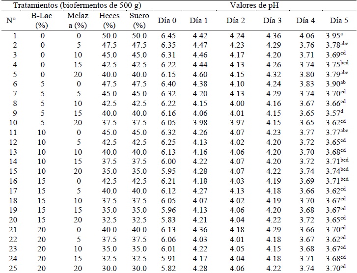 calcularon las cantidades fijas de B-Lac y melaza para cada tratamiento, completando la diferencia con heces de alpaca y lactosuero bovino en igual proporción (Ver Anexo 2). Los envases rotulados fueron cubiertos con bolsas de plástico sujetadas con ligas de hule y luego tapados herméticamente, incubándose en una estufa a 40 °C por 5 días (tiempo óptimo de fermentación), midiendo diariamente el pH con potenciómetro, cuyo descenso garantiza la ausencia de patógenos no deseados (Carrasco et al, 2002). Las mediciones al quinto día se analizaron mediante la aplicación del software estadístico SAS versión 8.0, en un diseño completo al azar con arreglo factorial 5 𝑥𝑥 5; realizando un Análisis de Varianza y la Prueba de Tukey (p<0.05). Para la elección del mejor tratamiento también se consideró el costo y accesibilidad de los insumos, monitoreando después el pH hasta el día 30 (Tabla 2).