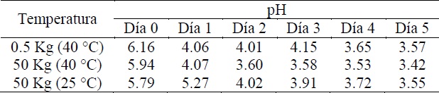 Hubo un descenso drástico del pH en todos los tratamientos al primer día de fermentación y luego un