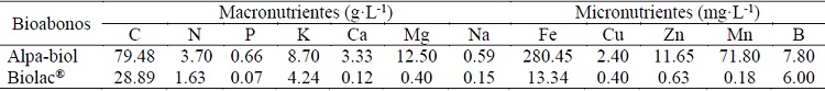El Alpa-biol posee mayores concentraciones de macro y micro-nutrientes con respecto al Biolac® (Tabla 3), y a los parámetros recomendados por Suárez (2009) para bioles de producción artesanal, quien propone concentraciones de N, P, K, Ca y B mayores a 700 mg·L-1, 170 mg·L-1, 1 300 mg·L-1, 1 800 mg·L-1, 270 mg·L-1 y 7 mg·L-1, respectivamente. Esta notable diferencia se atribuye a la alta capacidad de las BAL para degradar compuestos insolubles como la celulosa, hemicelulosa y lignina (Cóndor et al., 2007); explicándose con ello los altos contenidos de materia orgánica (137.02 g·L-1), sólidos totales (177.88 g·L-1) y densidad (1.057 g·ml-1). La relación C: N está dentro del rango óptimo para biofermentos (Tabla 3) que va de 20:1 a 30:1, con lo cual los microorganismos logran un óptimo crecimiento y una buena digestión de la materia orgánica; considerando que altas concentraciones de nitrógeno amoniacal implican pérdidas por volatilización y además resulta tóxico; mientras que su deficiencia afecta el crecimiento de los agregados bacterianos (Soria et al., 2001).