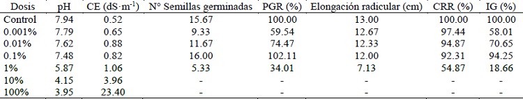comparado con los valores extremadamente ácidos que la dosis pura (pH= 3.95) y su dilución al 10% (pH= 4.15) proporcionan (Tabla 5). Por ello el Alpa-biol tuvo que diluirse al 0.1% para neutralizar los efectos fitotóxicos de su elevada acidez y salinidad, confiriendo el mayor IG (94.26%); mientras que las dosis más diluidas (0.01% y 0.001%) resultaron ser insuficientes para lograr un mejor efecto (Tabla 5 y Figura 6). Con la dilución al 0.1% la salinidad se redujo a 0.82 dS·m-1, valor que no indica problema para su uso en campo, según la clasificación de aguas de riego establecida por la FAO (Ayers & Westcott, 1985) y los Estándares Nacionales de calidad del agua de riego (Diario Oficial El Peruano, 2008).