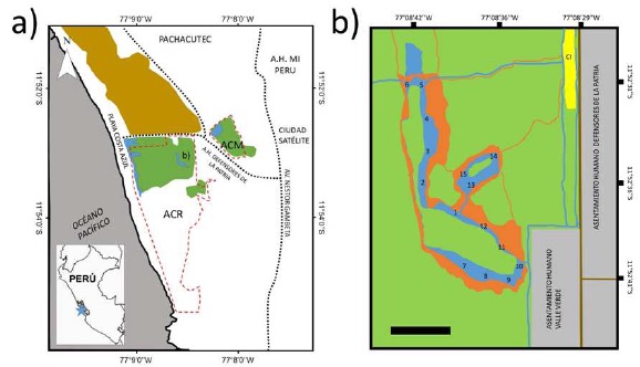 Los Humedales de Ventanilla se encuentran en la Provincia Constitucional del Callao, Distrito de Ventanilla, junto a la Playa Costa Azul, entre el Asentamiento Humano Defensores de la Patria y la Nueva Ciudadela Pachacútec (Figura 1 a y b). Los Humedales de Ventanilla limitan por el sur con colinas bajas, características del inicio de la Cordillera de los Andes; al este, colinda con zonas de expansión urbana como el AA. HH. Defensores de la Patria; y al oeste, con la línea paralela al mar. Alrededor existen zonas con vegetación de humedales que no están protegidas y que están destinadas a actividades agrícolas, ganaderas y de construcción (Aponte & Ramirez, 2014).