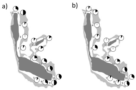 El monitoreo se realizó mensualmente desde agosto del 2014 a julio del 2015 en la laguna denominada “Pisciplaya”, laguna que es utilizada para recreación por la población circundante, en especial en los meses de verano, cuando centenas de pobladores la visitan (Gobierno Regional del Callao, 2009). Para determinar la calidad microbiológica del agua, se establecieron 15 estaciones de monitoreo localizadas en la periferia de la laguna (Figura 2). En estas estaciones se tomaron muestras de agua superficial. En ellas se cuantificaron los coliformes totales y termotolerantes, según lo indicado por el ECA del Perú (D.S. N°002-2008-MINAM. 2008). La población circundante tiene mayor acceso a cuatro de estos puntos (1, 5, 10 y 15); en ellos, además de lo indicado previamente, se cuantificó Escherichia coli, y Enterococcus faecalis, y se evaluó la presencia de Vibrio spp. y Salmonella spp. por ser patógenos de interés sanitario.
