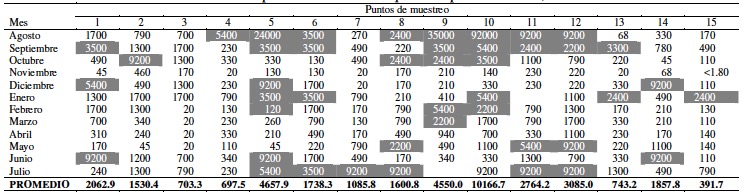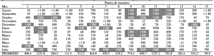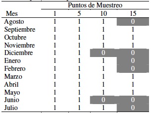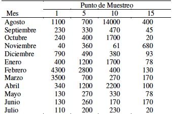 Se observó una fuerte presencia de Escherichia coli y Enterococcus faecalis en el punto 10. Este punto presentó los valores más altos entre las estaciones para ambos indicadores (Tablas 3 y 4); en los otros puntos la presencia fue menor. La presencia de Vibrio spp. fue casi constante durante el período de monitoreo, estando presente en todos los puntos (Tabla 5). Salmonella spp. estuvo ausente en todos los puntos.
