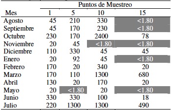 El muestreo y el procesamiento de todos los parámetros microbiológicos se realizaron teniendo en cuenta las recomendaciones y métodos estándar descritos por Rice y colaboradores (Rice et al., 2012). Para cuantificar coliformes totales, coliformes termotolerantes, Escherichia coli . Enterococcus faecalis se utilizaron los métodos SM-9221B, SM-9221E, SM-9221F y SM 9230-SM 9230.B respectivamente. La lectura se hizo utilizando la tabla NMP (SM-9221B). Para la determinación de la presencia o ausencia de Vibrio spp. y Salmonella spp. se utilizaron los métodos SM 9260.B y SM 9260.H.