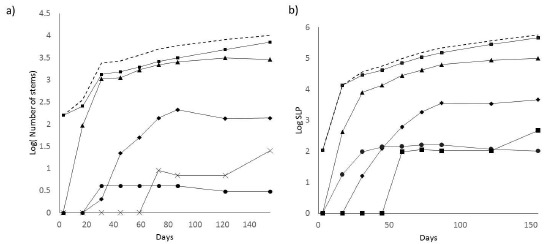 The number of stems and the LSP over time are shown in Figure 2. Schoenoplectus americanus (bulrush) was the species which recovered most rapidly during the evaluation period. This species had the highest abundance (69% of the stems) and growth (81% of LSP) over the 155 days, followed by saltgrass (28% and 18%, respectively); the other did not exceed 2% for both variables.