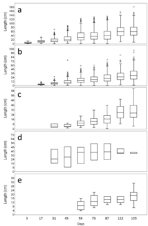 In order to analyze the length reached by the stems of each species throughout the entire evaluation period, box plots were produced using PAST 2.17c software (Hammer et al., 2001).