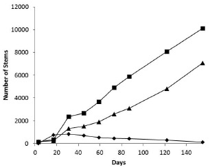 Throughout the study, the only species to flower was S. americanus, which was found to flower from day 31 (6 of the bulrush stems were flowering). The number of stems in flower continued to increase, although the proportion of these relative to the total number of stems continued to decline. By day 155, 940 of the stems were flowering (13.3% of the total) (Figure 5).