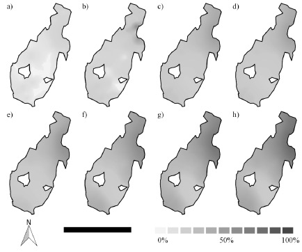 From the vegetation cover of the different plots, maps were built up in order to observe the recovery process over time. These maps were constructed by interpolating the vegetation cover using the Kriging technique (Oliver & Webster, 1990) using the ordinary spherical model. This process was carried out using Q.GIS 2.14 and SAGA GIS 2.2, allowing to produce graphs of the respective maps.