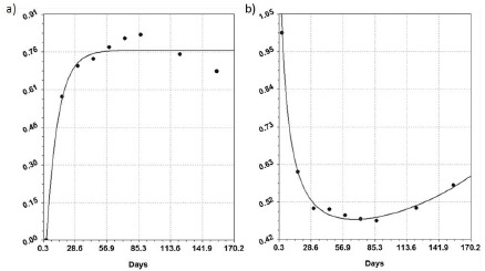 The Shannon Wiener index values show that alpha diversity grows according to an exponential model ( y=a(b-e-cx); a=1.02; b=7.47; c=9.76; se=0.05; r=0.99). Simpson’s Dominance values show that dominance decreases according to a rational function (y=(a+bx)/(1+cx+dx.); a=1.31; b=4.86; c=1.56; d=-3.95; se=0.01; r=0.99) (Figure 7). In both cases, diversity seems to have reached its highest value.